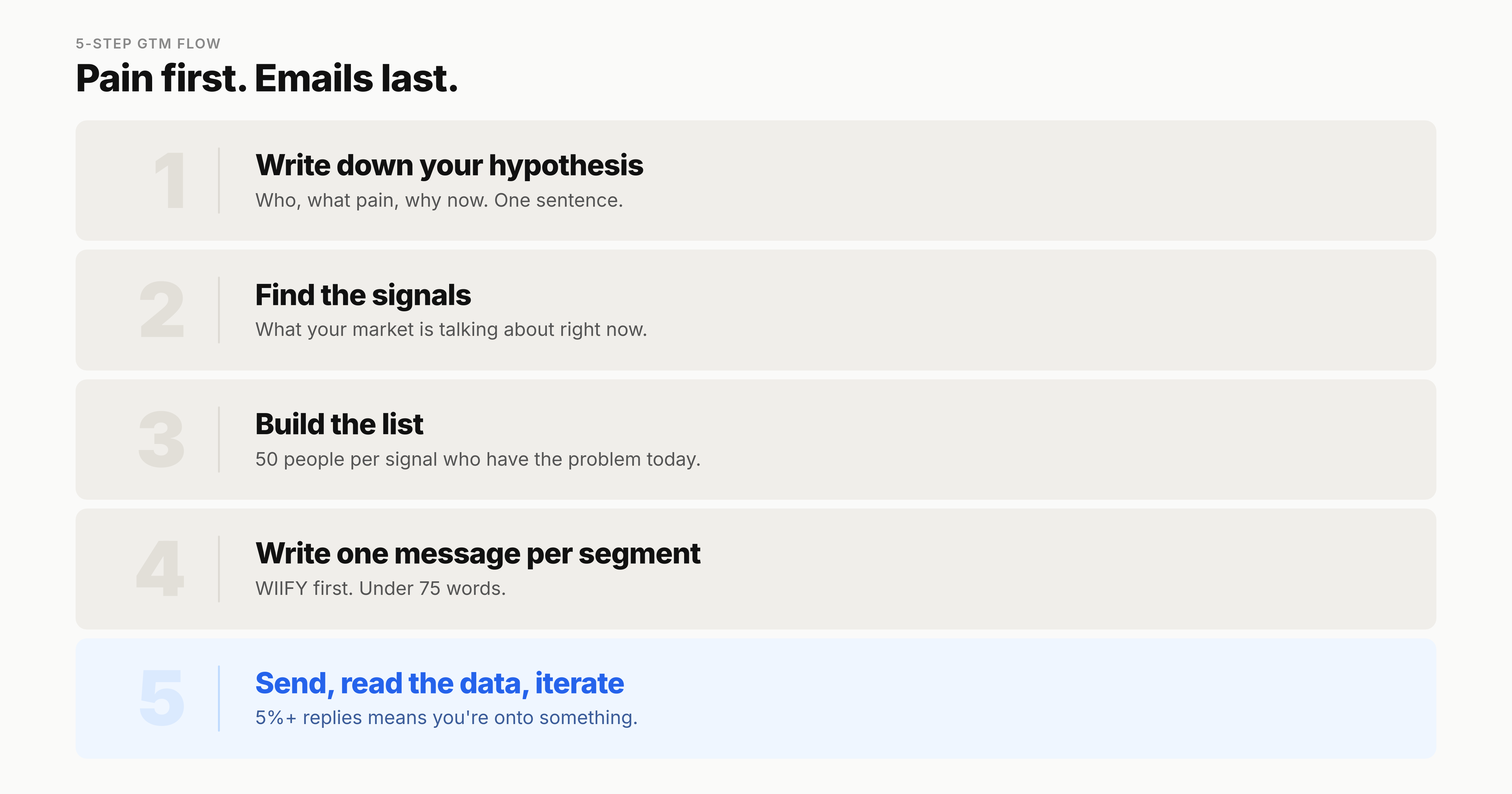 Then you find the 50 people who match those signals. LinkedIn profiles, emails, context. You write a short email that references the specific signal. You send it. You see what happens.