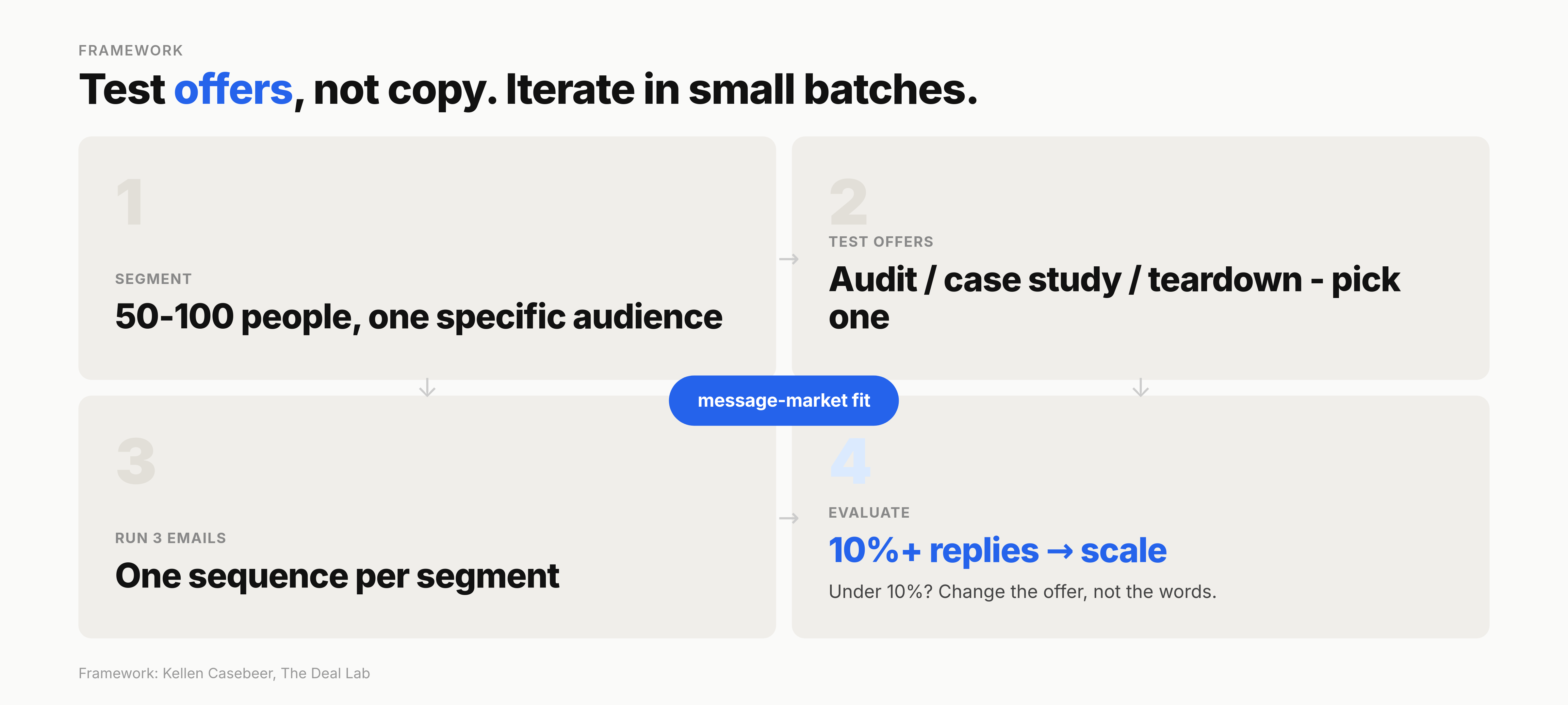 Run small batches - 50 to 100 contacts per segment, 3-email sequences. Don't scale anything until one segment pulls a 10%+ reply rate (Kellen's rule of thumb).